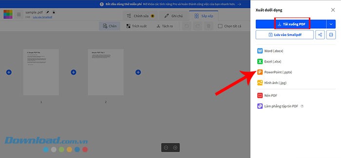 Bước 2: Chọn Tải xuống PDF để lưu file vào thiết bị của bạn dưới định dạng PDF gốc. Bạn cũng có thể chọn các định dạng khác như Word, Excel, PowerPoint hoặc Hình ảnh nếu muốn lưu trữ ở định dạng khác.