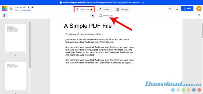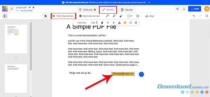 Bước 2: Chọn vị trí bạn muốn thêm văn bản và nhập nội dung cần thiết. Tính năng này cho phép người dùng thêm nội dung văn bản vào bất kỳ vị trí nào trong file PDF, tuy nhiên, nó chỉ khả dụng cho các tài khoản Smallpdf Pro.