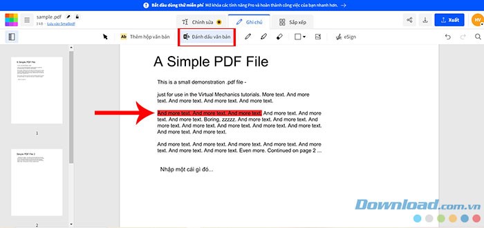 Chọn Đánh dấu văn bản và chọn màu sắc mong muốn, sau đó tô lên đoạn nội dung bạn muốn làm nổi bật. Smallpdf cũng cung cấp nhiều loại bút khác nhau để bạn có thể vẽ trực tiếp lên tài liệu.