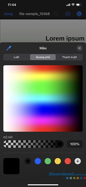 Nếu bạn muốn chọn một màu sắc đã có sẵn trong file PDF, hãy nhấn vào biểu tượng nằm ở góc trên cùng bên trái màn hình. Sau đó, di chuyển vòng tròn chọn màu đến vùng màu mà bạn mong muốn sử dụng. Cuối cùng, bạn có thể bắt đầu vẽ hoặc đánh dấu vào đoạn văn bản cần thiết và nhấn Xong để hoàn tất.