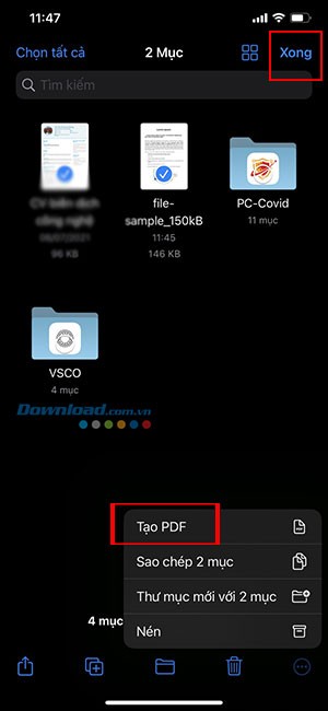 Sau khi đã chọn xong, chạm vào biểu tượng ba dấu chấm ngang xuất hiện ở góc dưới màn hình. Từ menu hiện ra, hãy chọn Tạo PDF, sau đó nhấn Xong để hoàn tất.