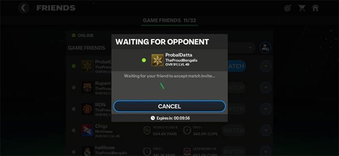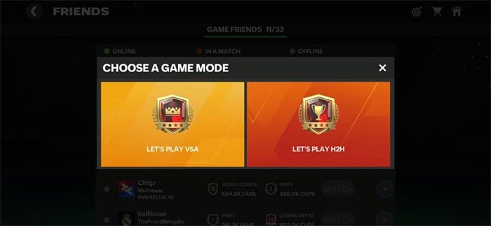 - Điều kiện tiên quyết là cả hai người chơi phải trực tuyến đồng thời trong FC Mobile. Một trong hai người có thể bắt đầu bằng cách chọn "Match" cạnh tên bạn bè trong danh sách, sau đó lựa chọn chế độ mong muốn (VS Attack hoặc H2H) và gửi lời mời.