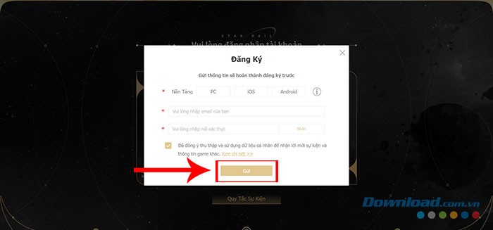 Bước 3: Một biểu mẫu Đăng ký sẽ hiện ra. Tại đây, bạn cần chọn Nền tảng dự định chơi game, cung cấp địa chỉ email và nhập mã xác thực tương ứng. Đừng quên chấp nhận các điều khoản và điều kiện trước khi nhấn nút Gửi để hoàn tất thủ tục đăng ký bản beta Honkai Star Rail.