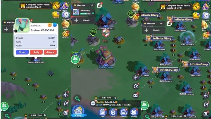 Trò chơi có Bản đồ thế giới, nơi người chơi có thể thu thập tài nguyên, mở khóa ô đất và nâng cấp công trình. Tại đây, người chơi sẽ gặp gỡ trại của những người chơi khác, bao gồm thành viên bang hội hoặc đối thủ, có thể trinh sát, hợp tác hoặc tấn công để cướp tài nguyên.