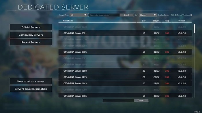 Người chơi có thể kết nối với một máy chủ Palworld bằng cách chọn Tham gia Trò chơi Nhiều Người chơi từ menu chính. Một danh sách các máy chủ khả dụng sẽ hiện ra, cho phép người chơi sắp xếp và tìm kiếm theo nhiều tiêu chí khác nhau.