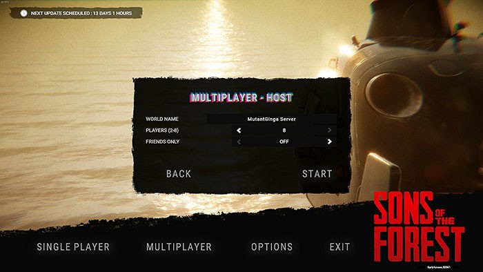 Sons of the Forest cung cấp hai phương thức chính để trải nghiệm trò chơi trực tuyến: tự tạo máy chủ hoặc kết nối vào một máy chủ đã được thiết lập trước. Ngay sau khi khởi động, người chơi có thể lựa chọn một trong hai tùy chọn này từ giao diện chính, thông qua mục Multiplayer nằm ở phía dưới màn hình.