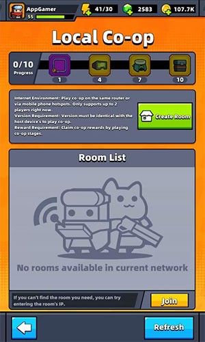 Để bắt đầu chơi với bạn bè, hãy chọn chế độ Local Co-op từ màn hình Trials. Sau đó, nhấn vào nút Create Room để tạo phòng chơi. Một mã phòng sẽ được hiển thị, cho phép người chơi sao chép bằng cách sử dụng nút Copy.
