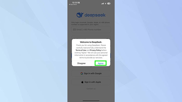Bạn có thể lựa chọn đăng nhập bằng tài khoản Google hiện có hoặc tạo một tài khoản mới theo cách thủ công, tương tự như quy trình trên phiên bản web. Người dùng cũng cần chấp nhận các Điều khoản sử dụng và Chính sách bảo mật của DeepSeek.
