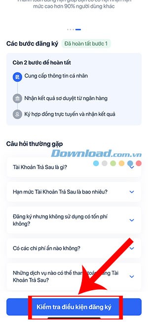 Bước 2: Tiếp theo, hãy nhấn vào Kiểm tra điều kiện đăng ký để đánh giá khả năng đáp ứng các yêu cầu. Thông tin chi tiết về Tài khoản trả sau của ZaloPay có thể được tìm thấy trong phần Câu hỏi thường gặp.