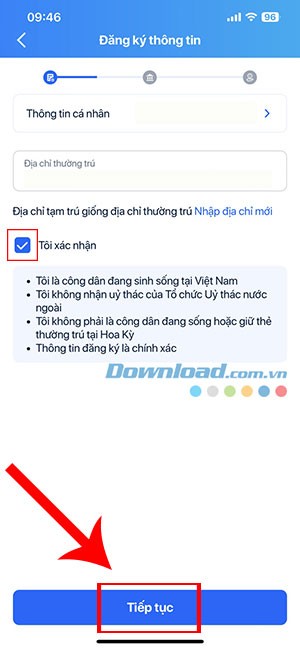 Bước 3: Rà soát lại các thông tin cá nhân đã cung cấp, đánh dấu vào ô Tôi xác nhận và chọn Tiếp tục.