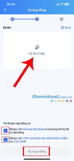 Bước 4: Đọc kỹ Nội dung hợp đồng, cùng với các chính sách và điều khoản liên quan. Sau đó, thực hiện Ký tên và xác nhận bằng cách nhấn Ký hợp đồng.