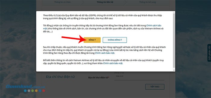 Bước 4: Để tiếp tục, hãy nhấn nút Đồng ý, xác nhận rằng bạn đã đọc và chấp nhận các điều kiện và điều khoản của chương trình hội viên Vietnam Airlines - Lotusmiles.