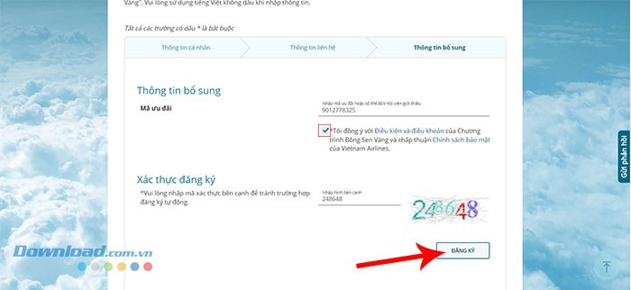 Đừng quên tích vào ô vuông để đồng ý với điều kiện và điều khoản của Chương trình Hội viên Lotusmiles - Bông Sen Vàng. Cuối cùng, hãy nhập mã xác thực được cung cấp và ấn nút Đăng ký.