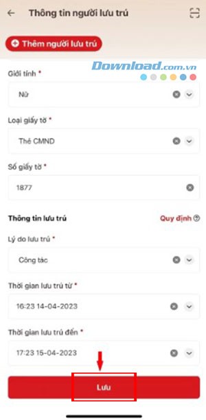 Bước 4: Tại mục Thông tin người lưu trú, nhấn vào Thêm người lưu trú. Điền đầy đủ các thông tin cần thiết của người lưu trú. Cuối cùng, nhấn nút Lưu để gửi yêu cầu đăng ký tạm trú lên hệ thống.