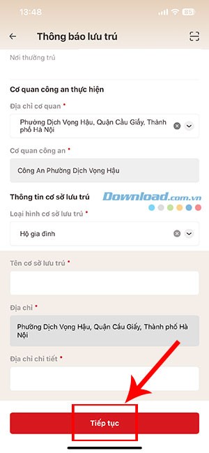 - Nhấn Tiếp tục để kết thúc việc khai báo tạm vắng.