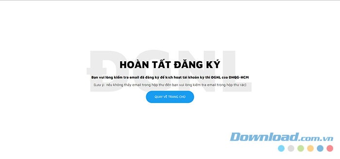 Bước 3: Sau khi đăng ký thành công, một thông báo Hoàn tất đăng ký sẽ được hiển thị. Thí sinh cần kiểm tra hộp thư điện tử đã cung cấp để xác thực và kích hoạt tài khoản cho kỳ thi ĐGNL của ĐHQG TP.HCM.