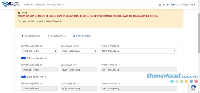 Bước 4: Bạn sẽ được chuyển hướng đến trang để hoàn thiện Hồ sơ thí sinh. Điền đầy đủ và chính xác thông tin trong ba tab: Thông tin cá nhân, Thông tin liên lạc và Thông tin ưu tiên.