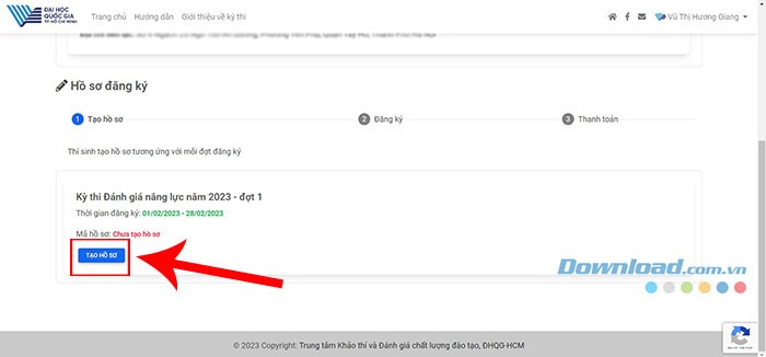 Bước 5: Sau khi hoàn thiện hồ sơ, hãy quay lại Trang chủ và chọn Tạo hồ sơ để bắt đầu quá trình đăng ký dự thi ĐGNL.
