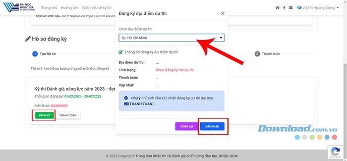 Bước 6: Lúc này, Mã hồ sơ của thí sinh sẽ được hiển thị. Tiếp tục nhấn vào Đăng ký, sau đó chọn địa điểm dự thi mong muốn. Cuối cùng, chọn Xác nhận để lưu các thay đổi và Đóng lại cửa sổ.