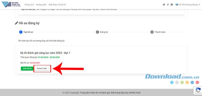 Bước 7: Nhấn vào mục Thanh toán để tiến hành nộp lệ phí dự thi.