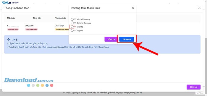 Các phương thức thanh toán được chấp nhận bao gồm các ví điện tử phổ biến như Viettel Money, Foxpay, MoMo và Payoo. Sau khi chọn ví điện tử, nhấn Xác nhận và sau đó Đóng lại.