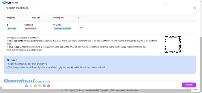 Bước 9: Một mã QR sẽ được hiển thị. Sử dụng camera của điện thoại để quét mã QR này, dẫn đến trang thanh toán lệ phí trên ứng dụng ví điện tử đã chọn. Thông tin thanh toán sẽ được cập nhật trong vòng 3 ngày làm việc kể từ khi giao dịch được thực hiện.