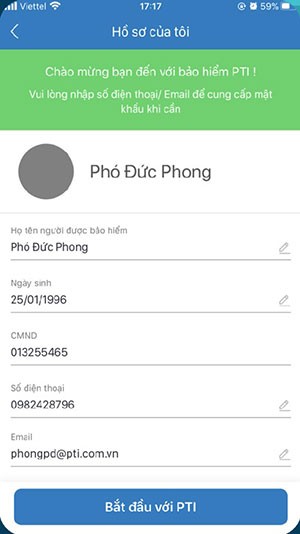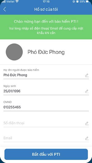 Bước 4: Sau khi đã điền đầy đủ thông tin cá nhân, nhấn vào Bắt đầu với PTI.