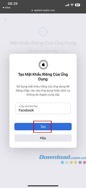 Bước 4: Nhập tên của ứng dụng mà bạn muốn thiết lập mật khẩu riêng và nhấn Tạo. Một mật khẩu sẽ được hệ thống tạo ra.