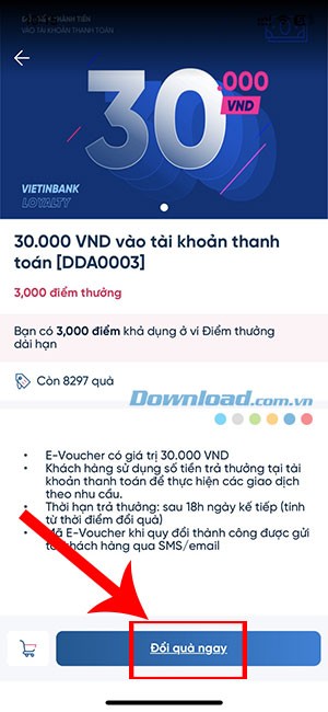 - Đối với phần thưởng là tiền mặt: Khoản tiền này sẽ được chuyển vào tài khoản thanh toán của bạn sau 18 giờ kể từ thời điểm bạn hoàn tất việc đổi quà.