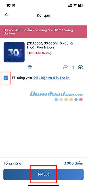 Bước 5: Đánh dấu vào ô Tôi đồng ý với Điều khoản và Điều kiện, sau đó ấn nút Đổi quà để xác nhận.