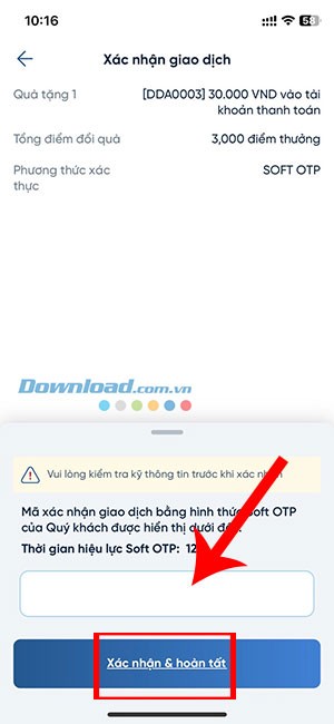 Bước 6: Nhập OTP hoặc Soft OTP vào cửa sổ Xác nhận giao dịch. Chọn Xác nhận & hoàn tất để hoàn tất việc đổi quà bằng điểm thưởng tích lũy.
