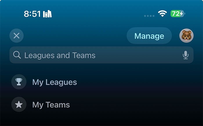Trong trường hợp muốn thêm giải đấu hoặc đội mới vào danh sách theo dõi sau này, người dùng chỉ cần nhấn vào ba đường ngang ở góc trên bên phải màn hình, chọn Manage và lặp lại các bước đã thực hiện trước đó.