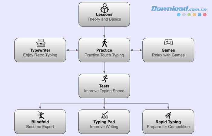 - Nội dung học tập chính: Typing Lessons, Typing Practice, Typing Tests.