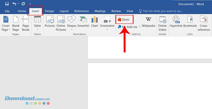 Bước 1: Trong tab Insert của Word, tùy thuộc vào cấu hình hệ thống, hãy chọn Add-ins > Store.