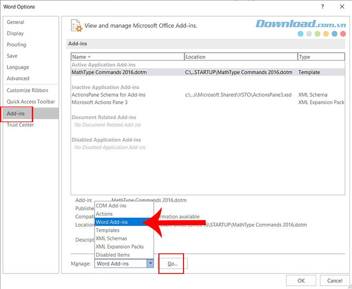 Tại phần Manage, hãy mở menu thả xuống bằng cách nhấn vào biểu tượng mũi tên và chọn Word Add-ins.
