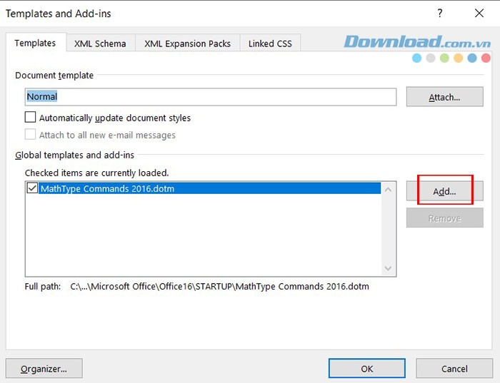 Bước 3: Nhấn vào nút Add trong cửa sổ Templates and Add-ins.