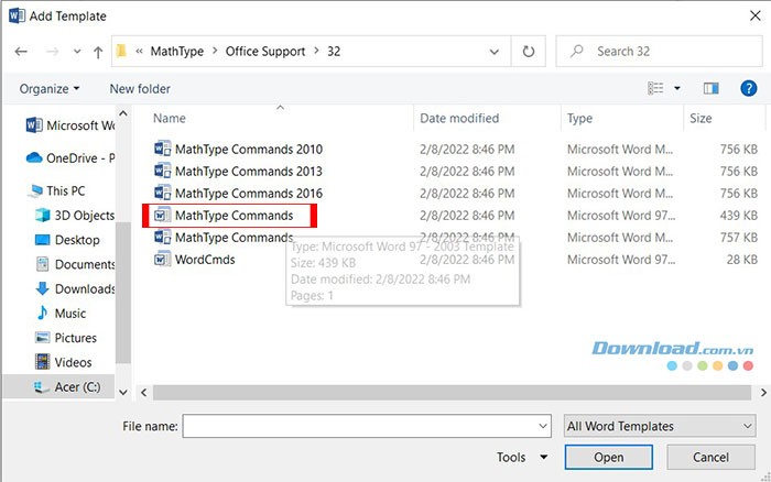 Bước 6: Chọn MathType Commands và nhấn nút Open.