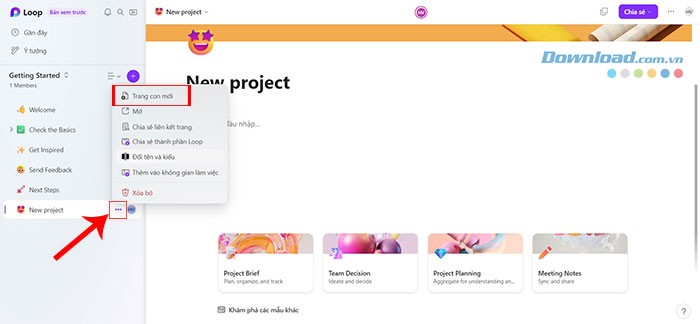 Bước 5: Để tạo các trang con (các phần nhỏ hơn trong một dự án lớn), người dùng chỉ cần nhấp vào ba dấu chấm nằm cạnh tên dự án chính. Tiếp theo, chọn Trang con mới từ cửa sổ hiện ra.