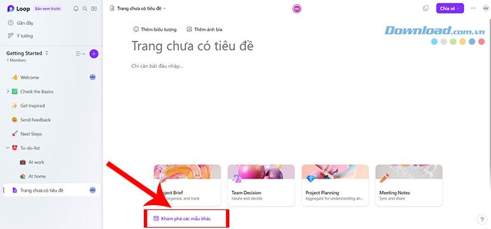Bước 1: Khởi động một trang Loop mới và tìm đến mục Khám phá thêm các mẫu, thường nằm ở cuối trang.