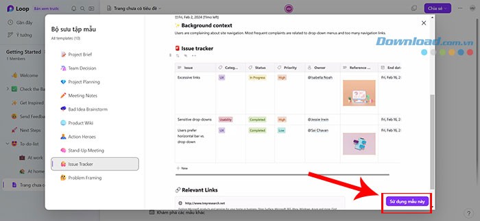 Bước 2: Một danh sách các bộ sưu tập mẫu, được phân loại theo chủ đề như lập kế hoạch, động não ý tưởng, hoặc ghi chép nội dung cuộc họp, sẽ hiển thị ở phía bên trái màn hình. Người dùng chỉ cần lựa chọn một mẫu phù hợp, xem trước giao diện của nó, và sau đó nhấn vào Sử dụng mẫu này.