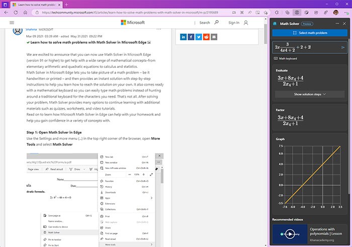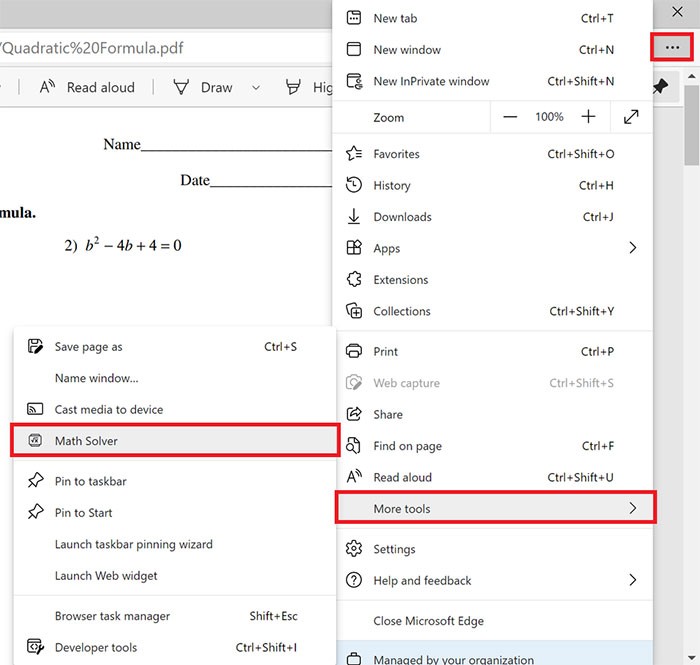Thứ hai, Math Solver được tích hợp sẵn và có thể truy cập trực tiếp từ bên trong trình duyệt Edge. Để thực hiện, hãy nhấp vào ba dấu chấm biểu tượng ở góc trên cùng bên phải của Edge, sau đó chọn More tools và tiếp tục chọn Math Solver. Ngoài ra, người dùng cũng có thể khởi động Math Solver nhanh chóng bằng cách nhấp vào biểu tượng Math Solver trên thanh tác vụ của Edge.