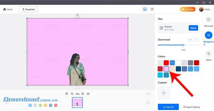 Bên cạnh việc xóa nền, người dùng còn có thể tùy biến phông nền bằng cách lựa chọn các màu sắc khác nhau từ mục Colors, được bố trí ở phía bên phải giao diện chỉnh sửa.