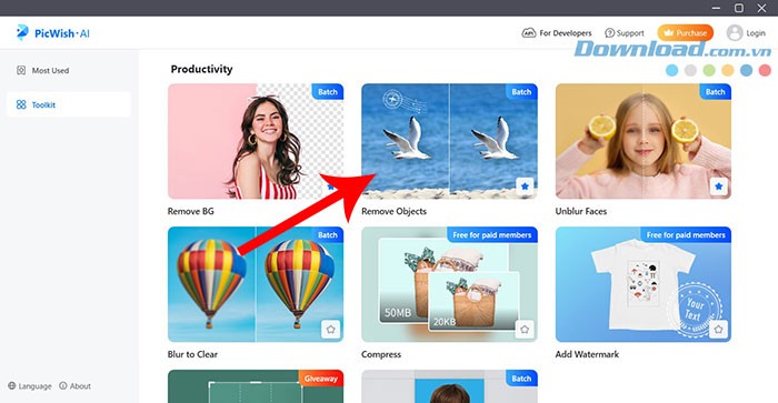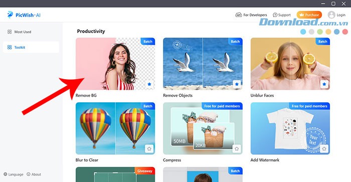 Bước 1: Truy cập vào tab Toolkit và chọn công cụ Remove BG.