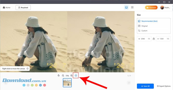 Bước 2 yêu cầu bạn chờ đợi cho đến khi ứng dụng hoàn tất việc xử lý và làm nét ảnh. Sau khi quá trình này kết thúc, hãy nhấn vào biểu tượng hình chữ nhật để có thể so sánh trực quan sự khác biệt giữa ảnh gốc và ảnh đã được cải thiện.