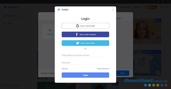 Bước 4: Nếu bạn chưa có tài khoản PicWish, hệ thống sẽ yêu cầu đăng nhập thông qua Google, Facebook hoặc Twitter để tiếp cận các tính năng miễn phí.