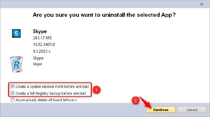 Nếu bạn không có nhu cầu tạo System Restore Point hoặc sao lưu Registry, hãy bỏ chọn các tùy chọn tương ứng trước khi nhấn vào Continue để tiếp tục.