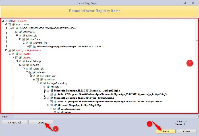 Khi lựa chọn các mục Registry còn lại để xóa, cần lưu ý rằng chỉ những mục được in đậm mới thực sự bị loại bỏ. Các mục khác (không in đậm và màu đỏ) chỉ được hiển thị để cung cấp thông tin, giúp người dùng xác định vị trí của các mục in đậm trong Registry.
