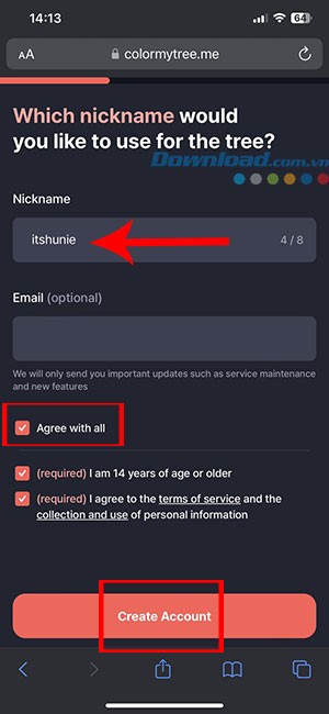 Tiếp theo, hãy đánh dấu chọn vào ô Agree with all để đồng ý với các điều khoản và điều kiện sử dụng của Colormytree.