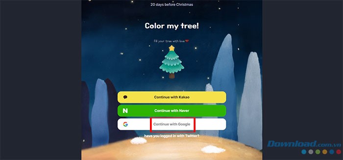 Bước 1: Truy cập vào trang web https://colormytree.me/ . Sau đó, chọn một trong các tùy chọn đăng nhập: Continue with Kakao, Naver hoặc Google để kết nối với tài khoản của bạn.