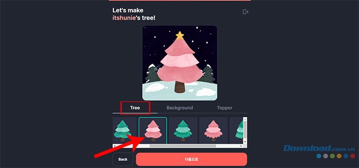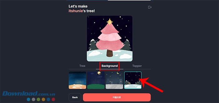 Bước 2: Tiến hành thiết kế cây thông của bạn bằng cách lựa chọn Tree (kiểu dáng cây), Background (hình nền) và Topper (đồ trang trí đỉnh cây). Khi đã hoàn thiện việc trang trí, hãy nhấn vào Next step để tiếp tục.